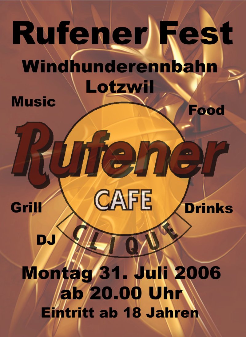 Am Montag 31. Juli 2006 findet unser alljährliches Rufener Fest statt. Die Party steigt ab 20.00 Uhr bei der Windhunderennbahn in Lotzwil. Hier findet sich der Flyer!