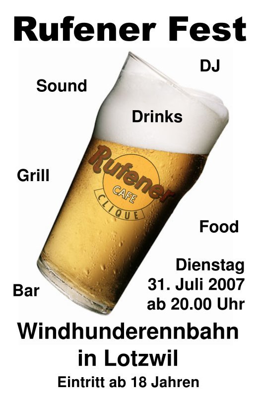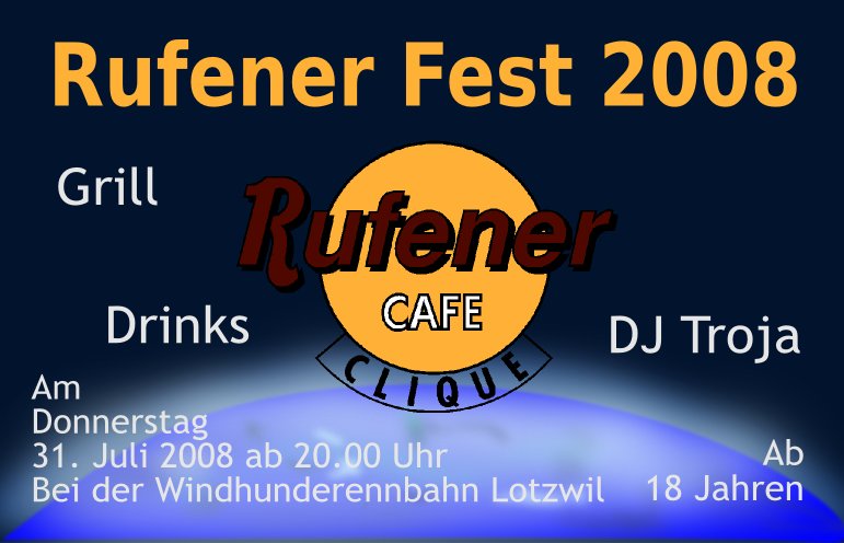 Am Dienstag 31. Juli 2007 findet unser Rufener Fest 2007 statt. Wie letzes Jahr startet die Fete 20.00 Uhr bei der Windhunderennbahn in Lotzwil. Hier geht's zum Flyer 2007!